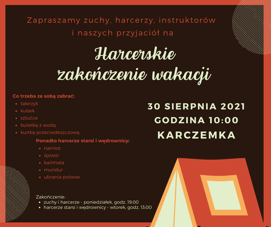 Zapraszamy wszystkie zuchy, harcerzy, instruktorów i naszych przyjaciół na harcerskie zakończenie wakacji, które odbędzie się w poniedziałek 30 sierpnia 2021r. Spotykamy się na Karczemce o godzinie 10:00.