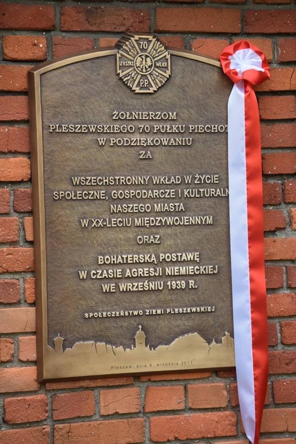 „Żołnierzom pleszewskiego 70 Pułku Piechoty w podziękowaniu za wszechstronny wkład w życie społeczne, gospodarcze i kulturalne naszego miasta w XX-leciu międzywojennym oraz bohaterską postawę w czasie agresji niemieckiej we wrześniu 1939 roku. Społeczność Ziemi Pleszewskiej”